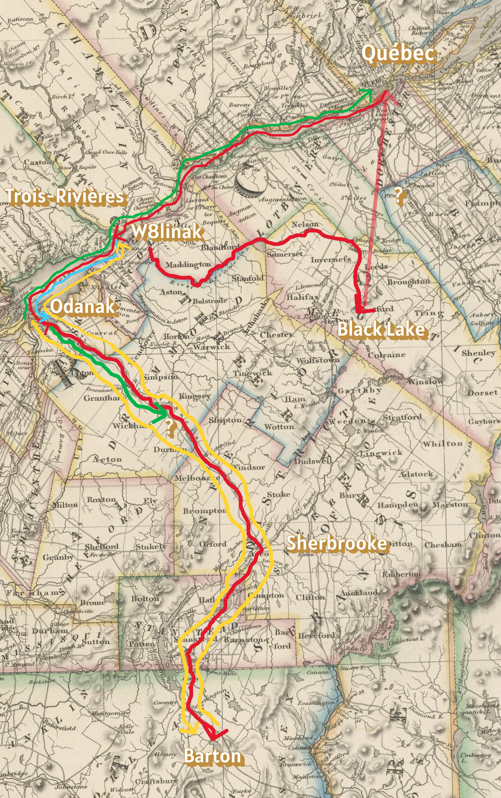 Jaune : Trajet effectué par des W8banakiak d’Odanak