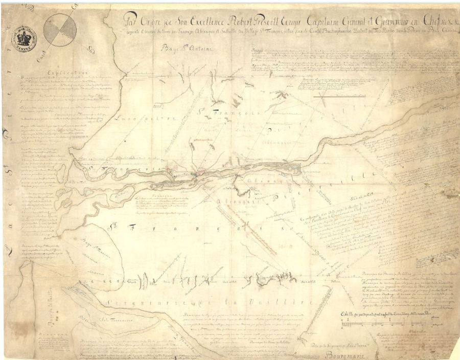 Bibliothèque et Archives nationales à Québec, fonds ministère des terres et forêts, Plan des terres des sauvages Abénaquis et Sokokis du village St-François, arpentées et dessinées, situées dans le comté de Buckinghamshire, district des Trois-Rivières dans la Province du Bas Canada, effectué par ordre de son Excellence Robert Prescott, Odanak, 1798. https://numerique.banq.qc.ca/patrimoine/archives/52327/3139595