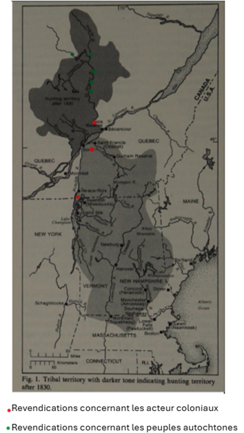 Comme le mention l’anthropologue Claude Gélinas, « peu de temps après la Conquête, les [W8banakiak] d’Odanak ont commencé à porter plainte auprès des autorités politiques contre l’empiétement des Canadiens sur leurs terres de chasse »[1]. En effet, une migration des colons et des loyalistes sur les territoires des W8banakiak au sud du Québec oblige le déplacement des territoires de chasse de la communauté vers territoires de chasses. Elle marque également l’augmentation de pétitions des W8banakiak pour l’obtention de terres agricoles et la réobtention de leurs territoires.